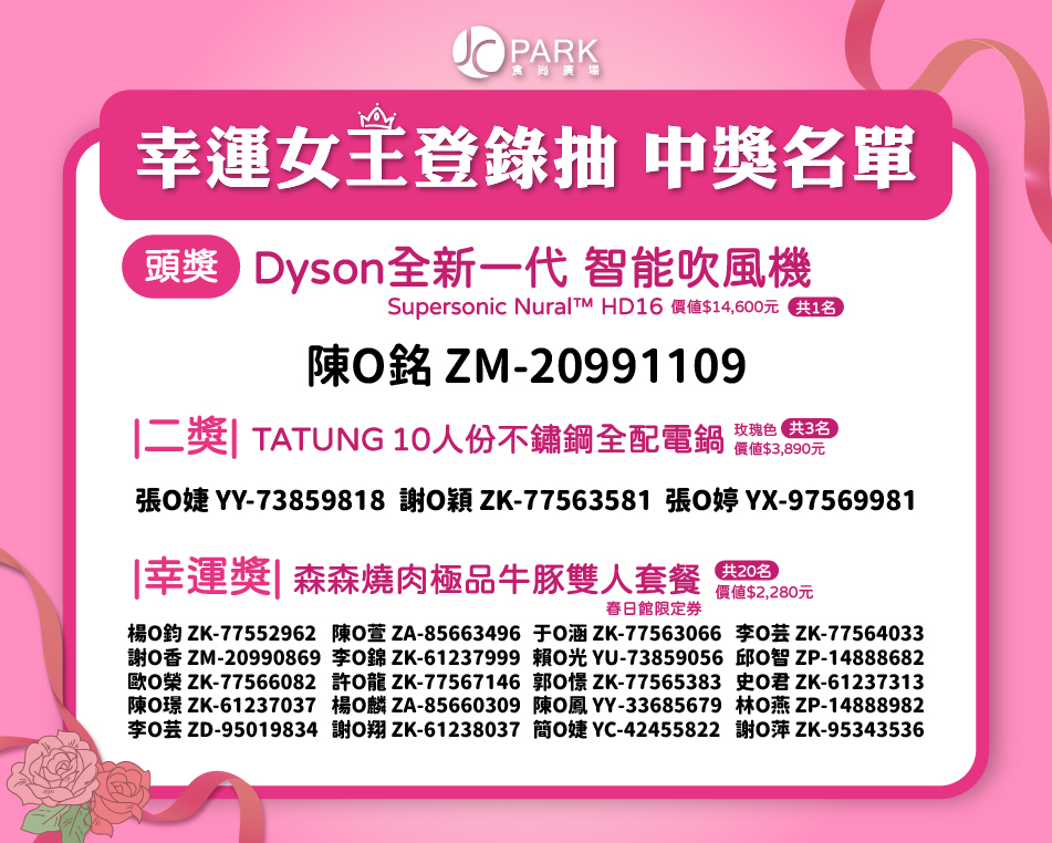 (1)中獎人須於115/04/06(一)下午3:00前,回覆私訊粉絲專頁告知得獎項目並出示中獎發票圖檔兌獎 (粉絲專頁連結 https://reurl.cc/28j24a),以利後續領獎作業進行,逾期未回覆即視為中獎人放棄中獎資格/權益,恕獎品不予補發。